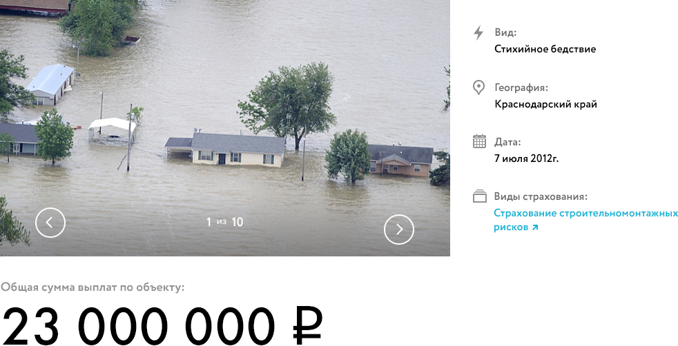Раздел «Страховые выплаты» показывает посетителю, что компания выполняет свои обязательства. Описаны страховые случаи, их место происшествия, дата и сумма компенсации.