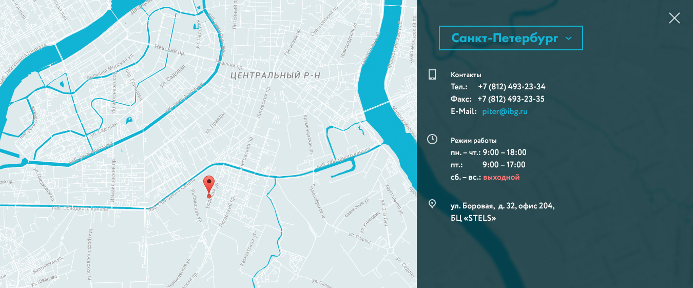 - Три ключевых направления для посетителей сайта (размещенные рядом с логотипом) — для корпоративных клиентов, для частных клиентов и общая информация об IBG.